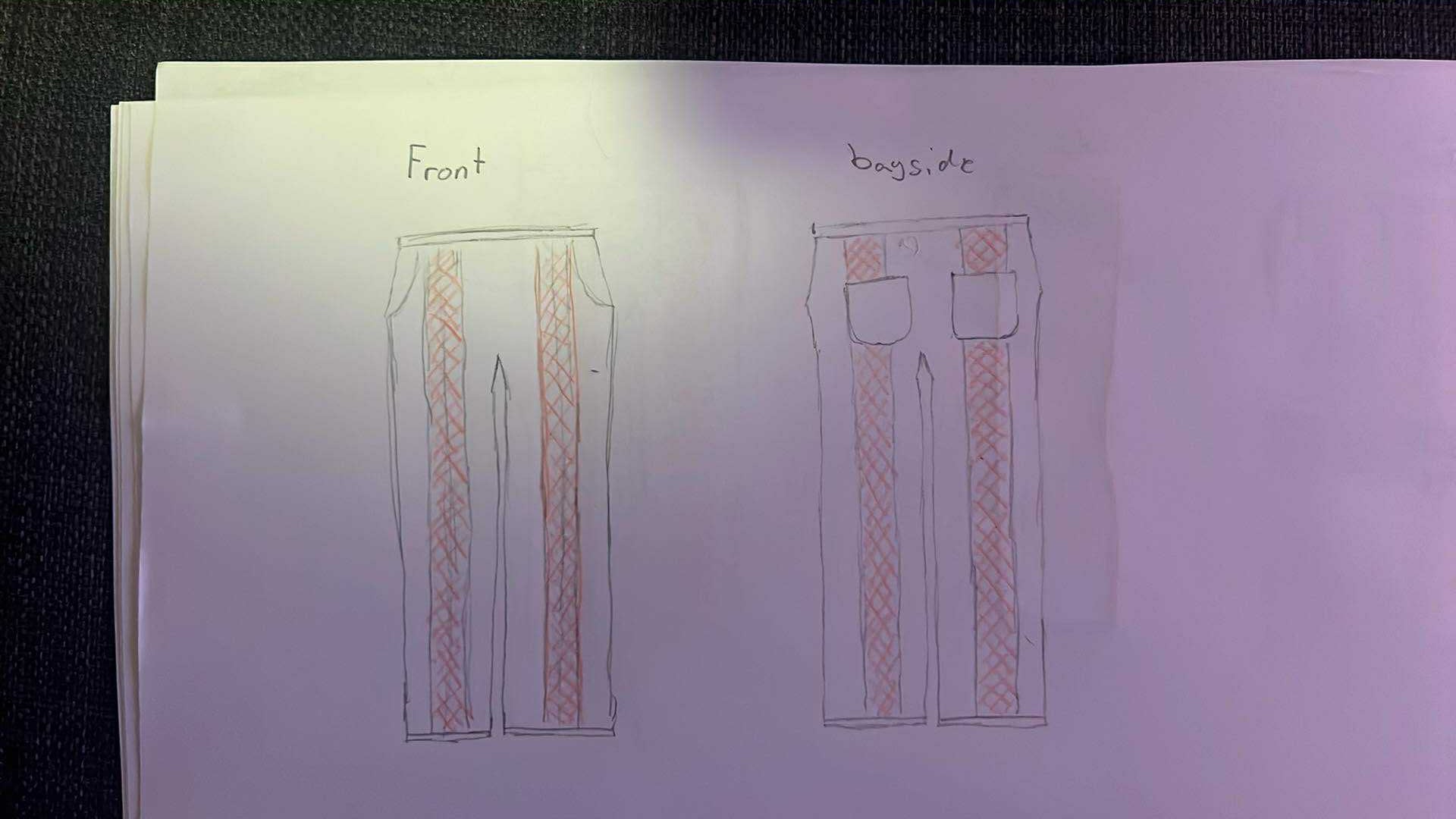 Her viser vi den tidlige udvikling af SpringFit – fra håndtegnede skitser til de første mockups. De hjælper os med hurtigt at teste idéer, placering af støtte og buksernes bevægelse, før vi bygger prototyper.